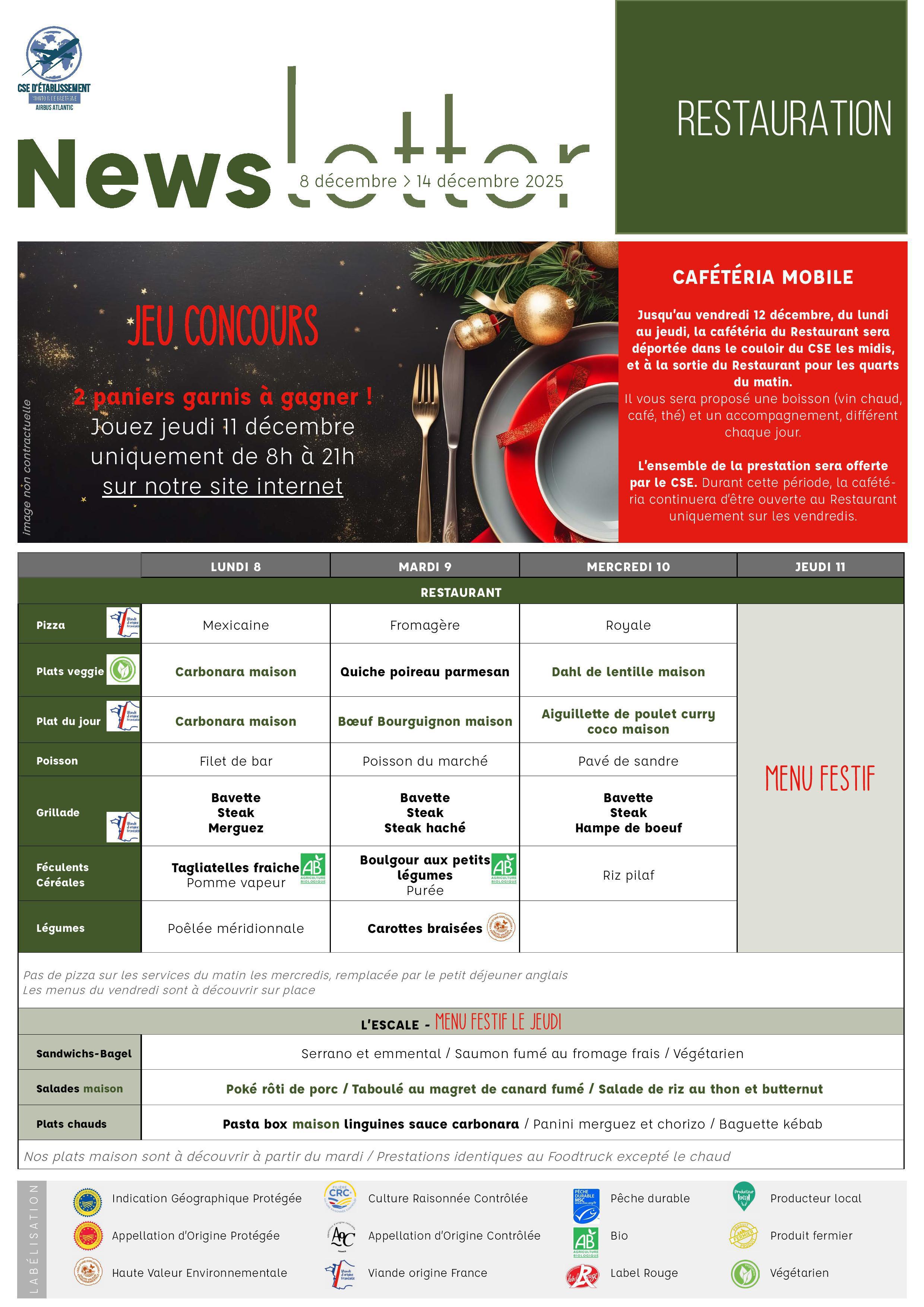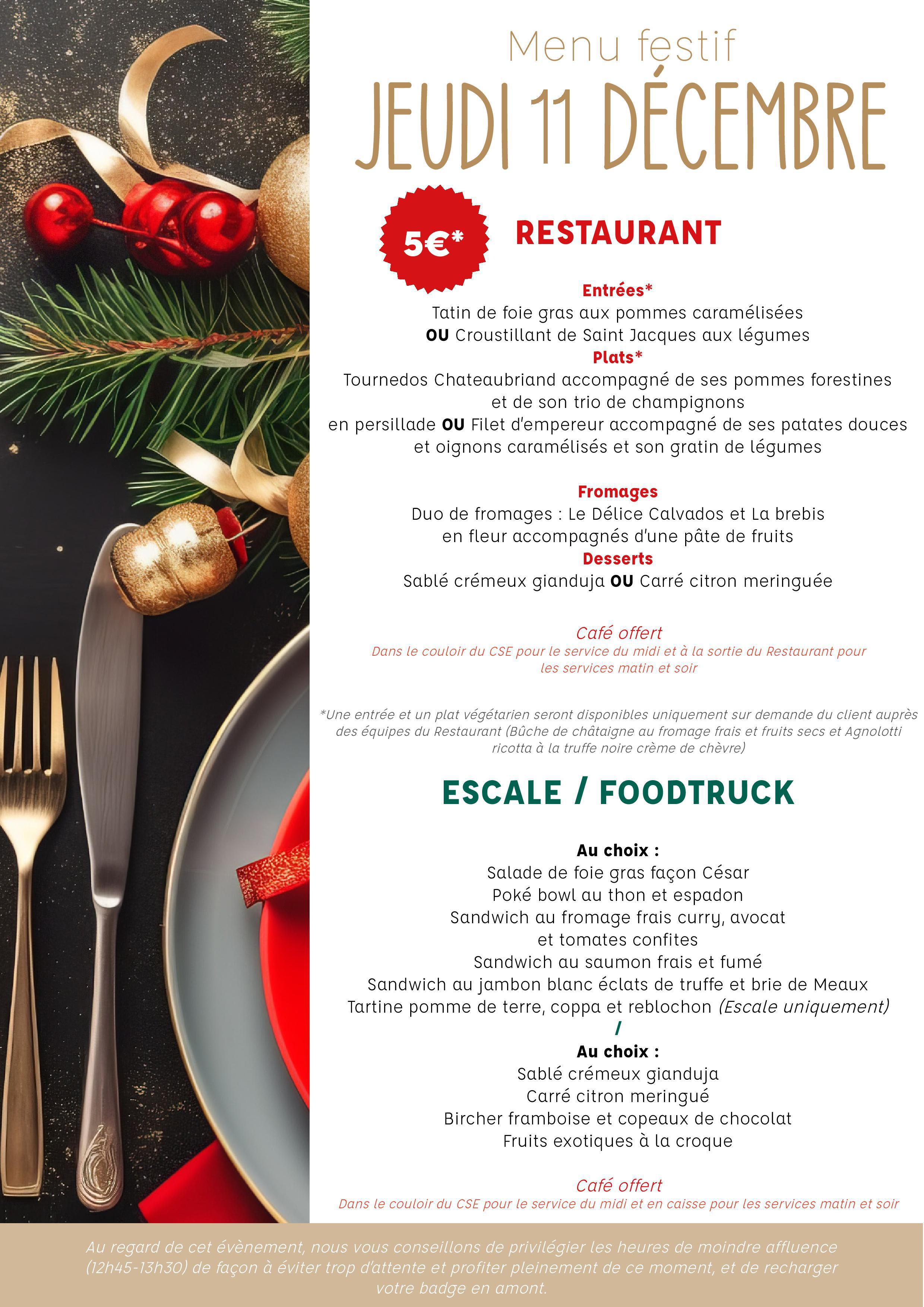 Les menus festifs du 11 Décembre au restaurant d'entreprise, Escale et Foodtruck.