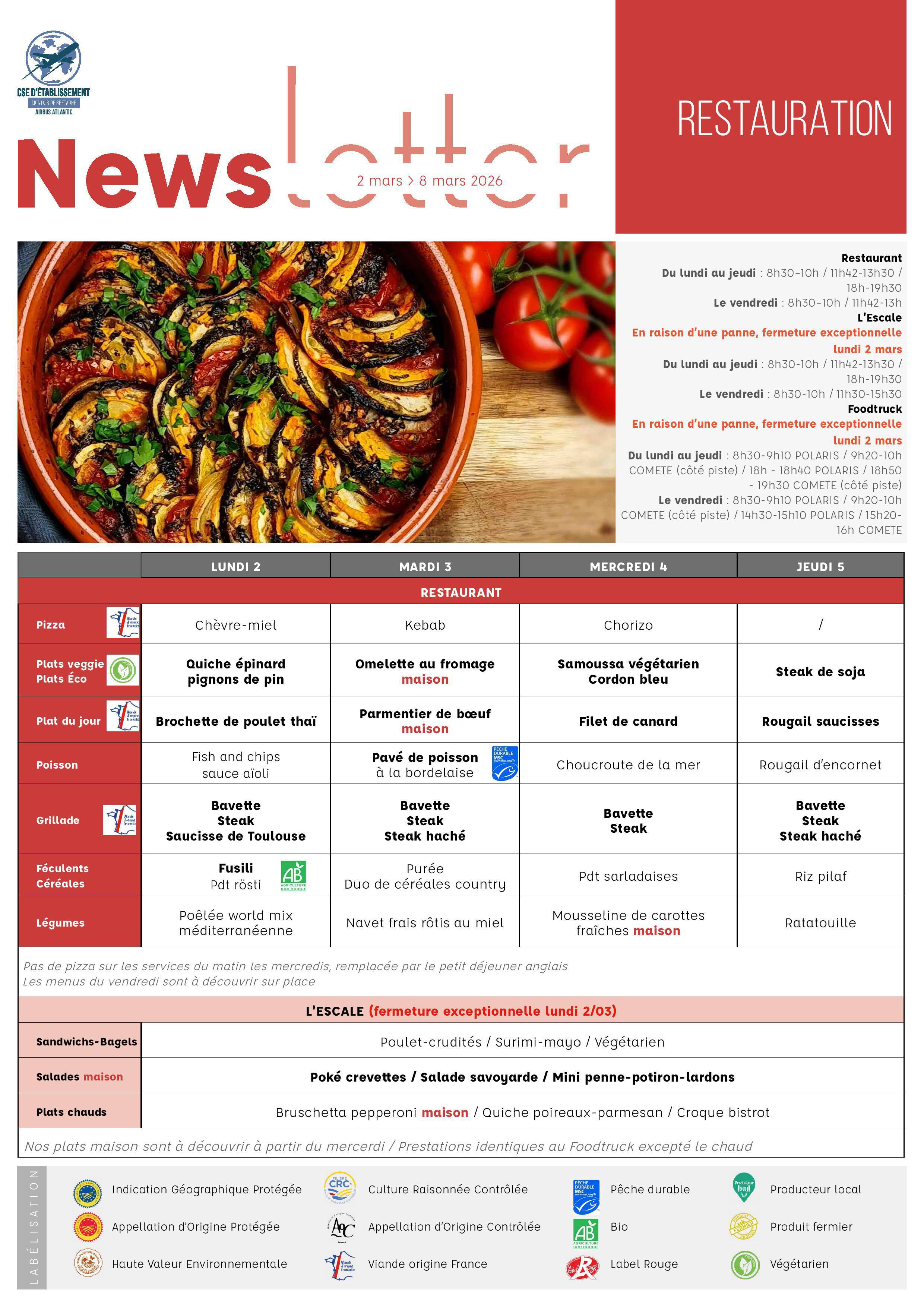 - Les menus de la semaine à l'Escale/Foodtruck.(fermeture exceptionnelle de l'escale le Lundi 2 Mars)