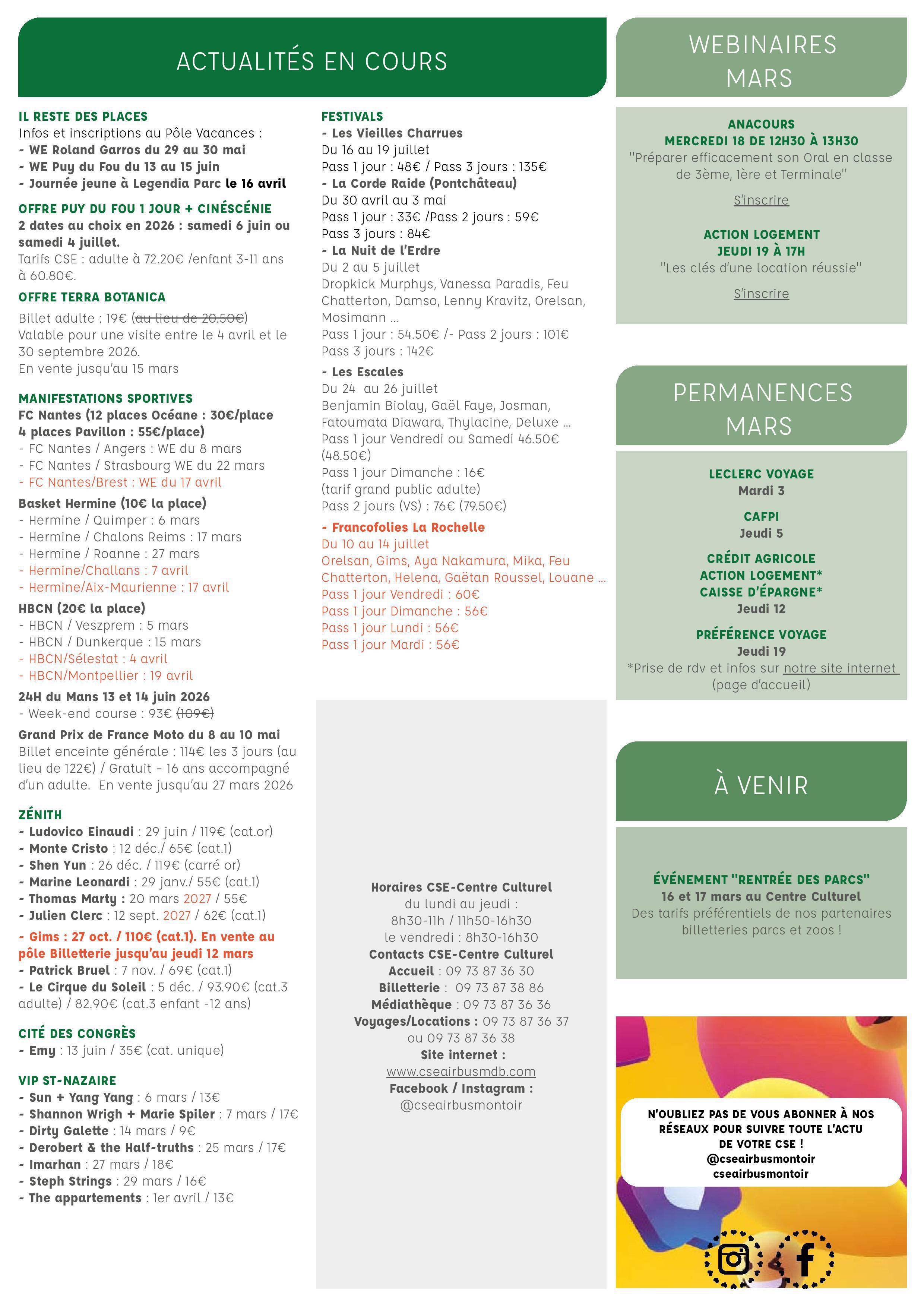 - Info sur les permanences de Mars : Leclerc Voyage, CAFPI, Crédit Agricole, Action Logement, Caisse d'Epargne, Préférence Voyage.