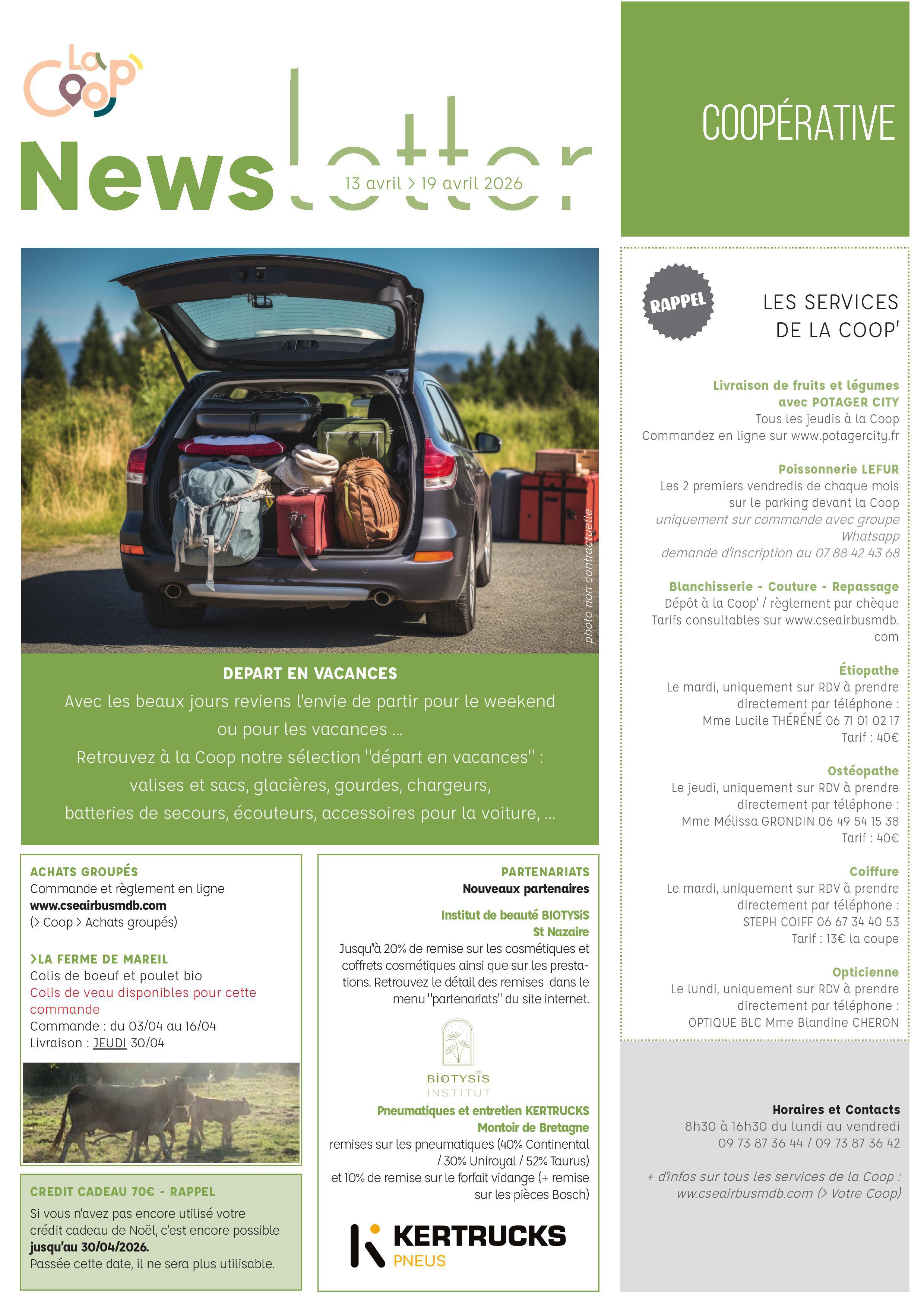 - Nos nouveaux partenariats : "Institut de beauté BIOTYSiS" à St Nazaire et "Pneumatiques et entretien KERTRUCKS" à Montoir de Bretagne.