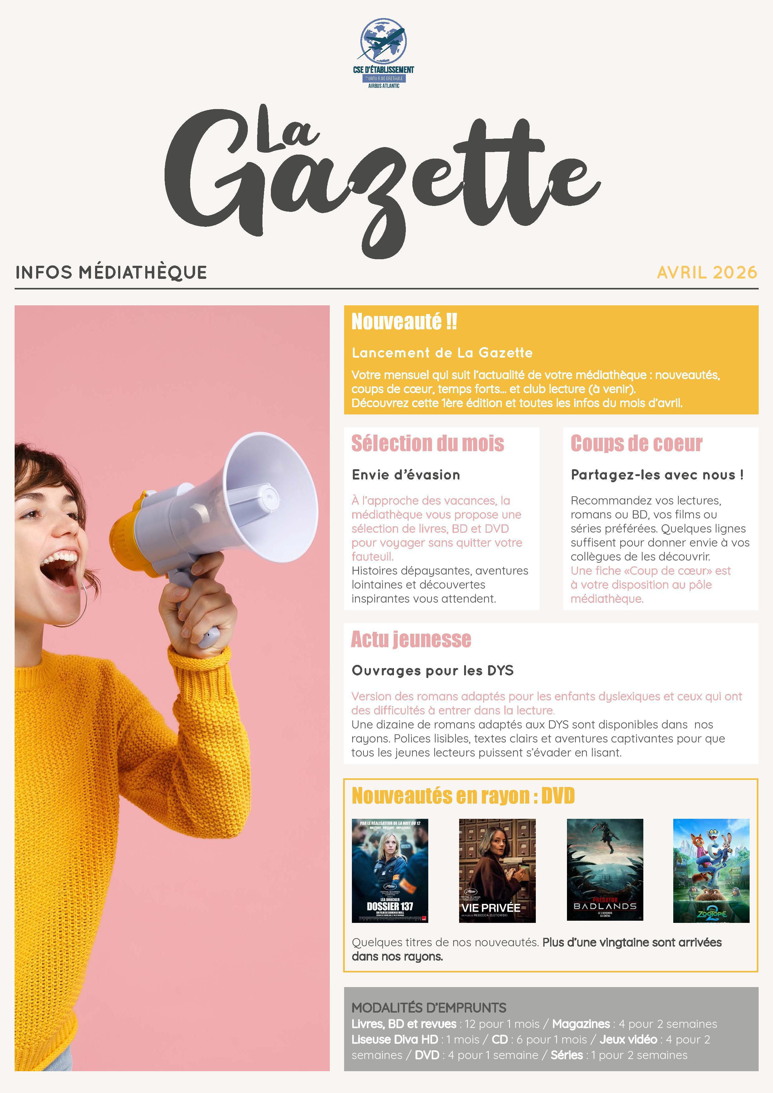 Découvrez dans cette newsletter le lancement de "La Gazette" : Votre mensuel qui suit l’actualité de votre médiathèque => nouveautés, coups de cœur, temps forts… et club lecture (à venir).