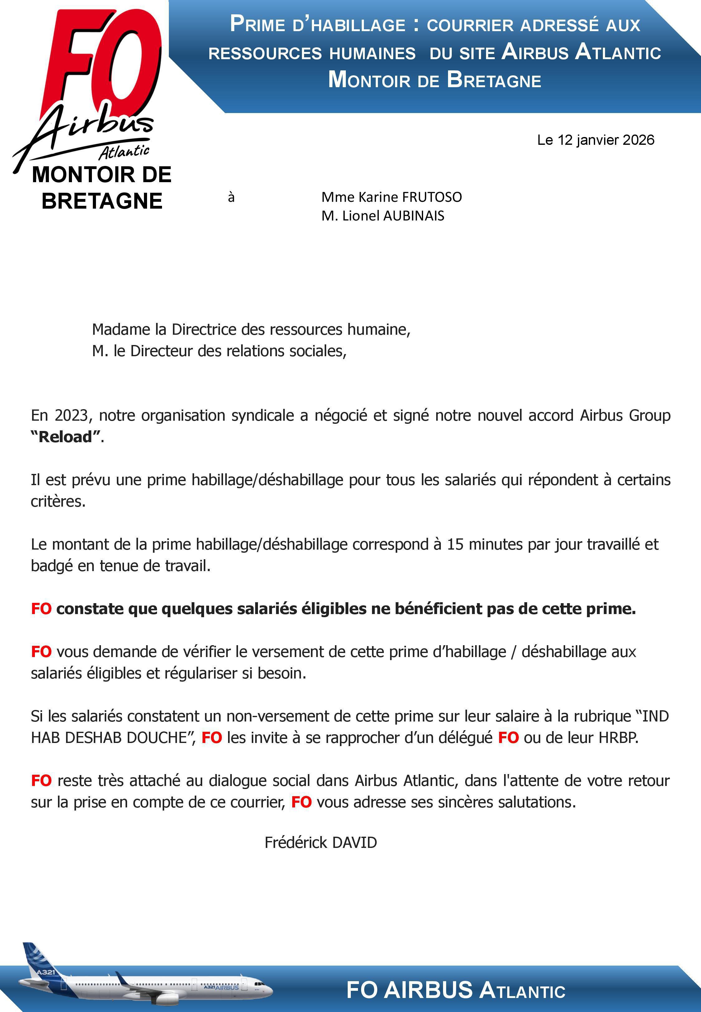 Prime d'habillage : FO adresse un courrier aux Ressources Humaines du Site AA Montoir de Bretagne